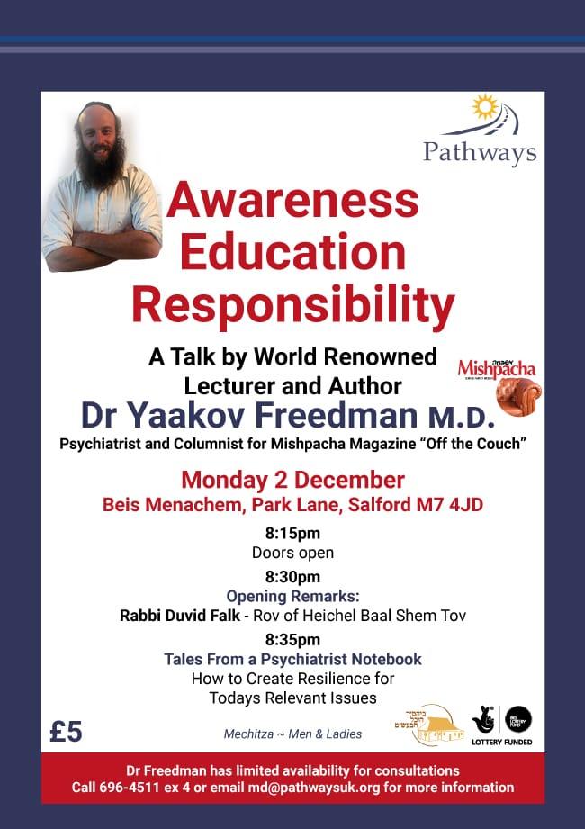 The talks will be geared towards professionals and community members alike and are being organized by my dear colleague Rabbi Melech Dovid Kantor of PathwaysUK.
