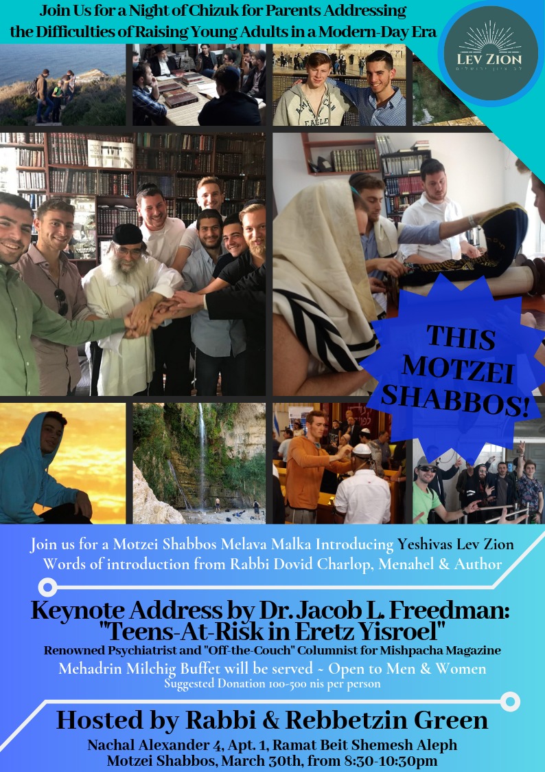It’s a big zechut to speak in Beit Shemesh on behalf of Lev Zion, a fantastic Yeshivah here in Yerushalayim run by Rabbis Dovid Harlop and Yitzi Tendler.